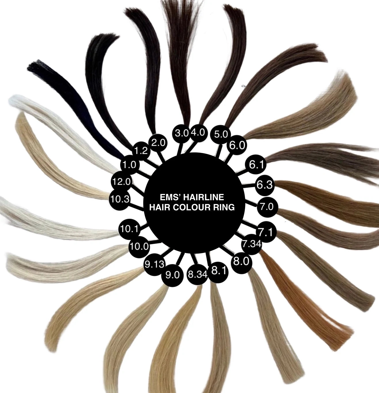 Please note that the individual photos of the hair colours are not of optimal quality. For clearer reference, kindly refer to the EMS’ HAIRLINE Hair Colour Ring.